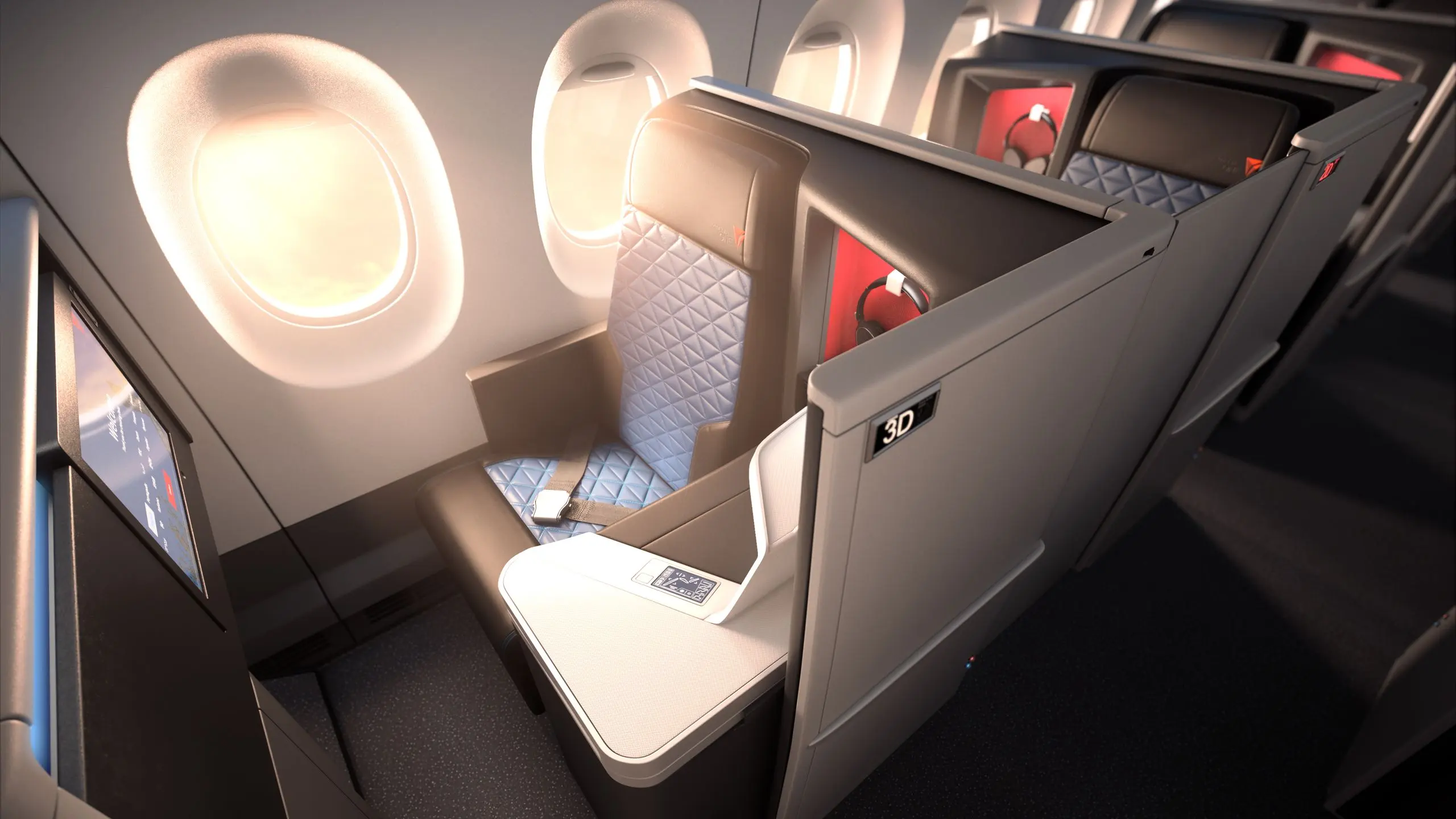 - “Delta One Suites” featuring sliding doors and lie-flat beds